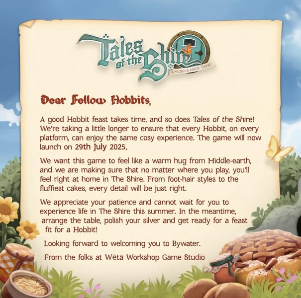 A good Hobbit feast takes time, and so does Tales of the Shire! We're taking a little longer to ensure that every Hobbit, on every platform, can enjoy the same cosy experience. The game will now launch on 29th July 2024.